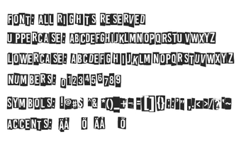 All Rights Reserved é uma fonte de exibição ousada que combina a estética rebelde da tipografia de notas de sequestro com um toque moderno. Com letras que parecem recortadas de diferentes texturas de papel, a fonte apresenta um design dinâmico com sombras marcantes que conferem profundidade. Os contornos levemente irregulares e os detalhes desgastados proporcionam uma qualidade tátil que evoca um humor lúdico e ousado, ideal para chamar a atenção em diversos projetos.